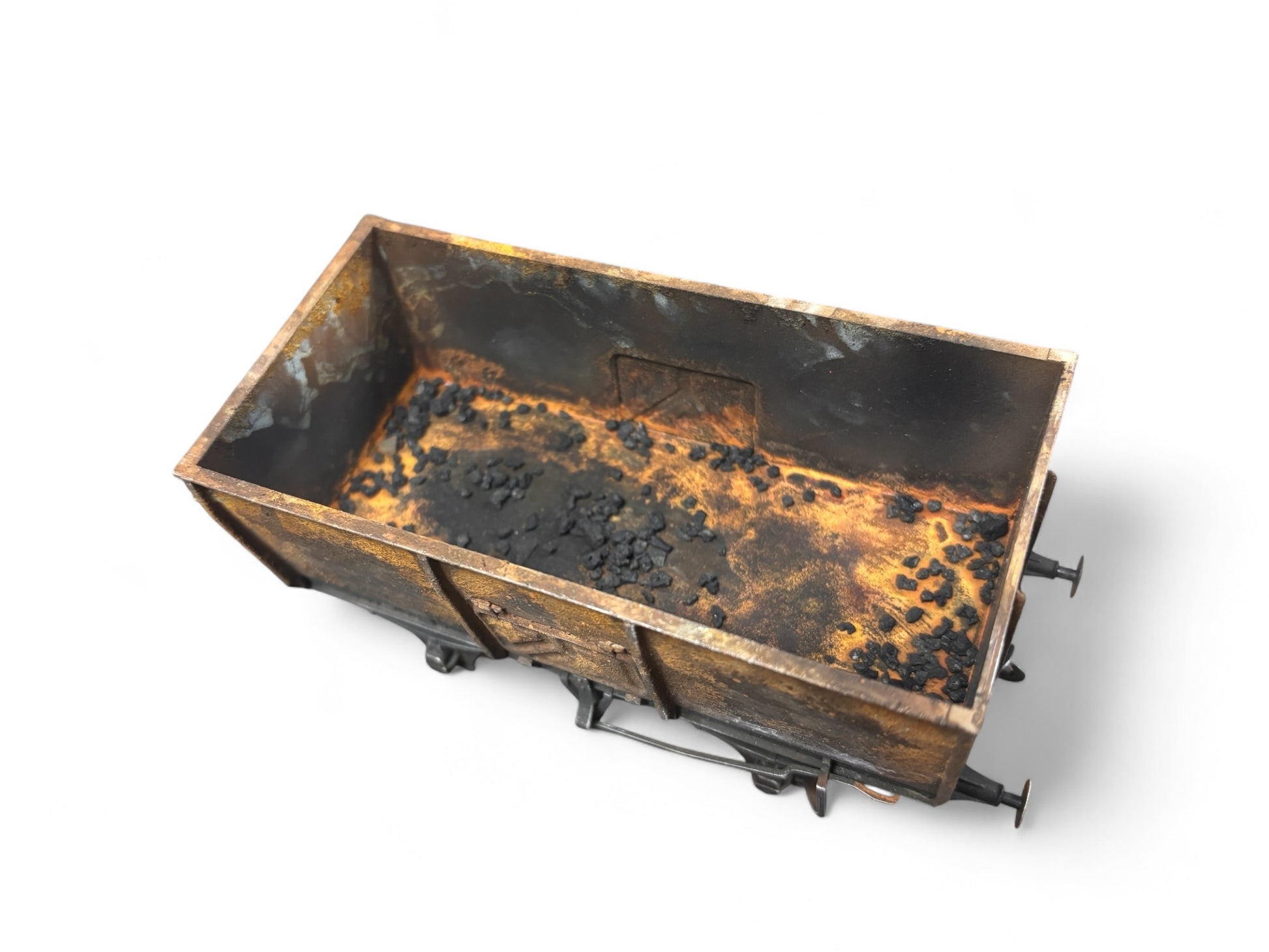 Each wagon is uniquely weathered. The image shows the actual finished wagon with real rust patches and interior.
