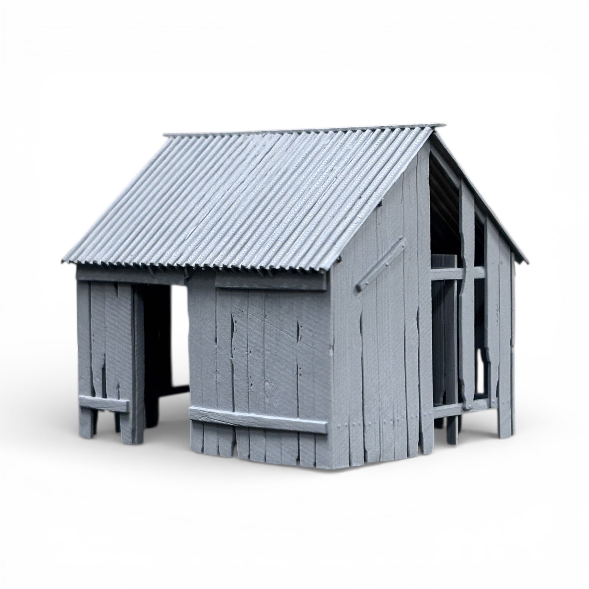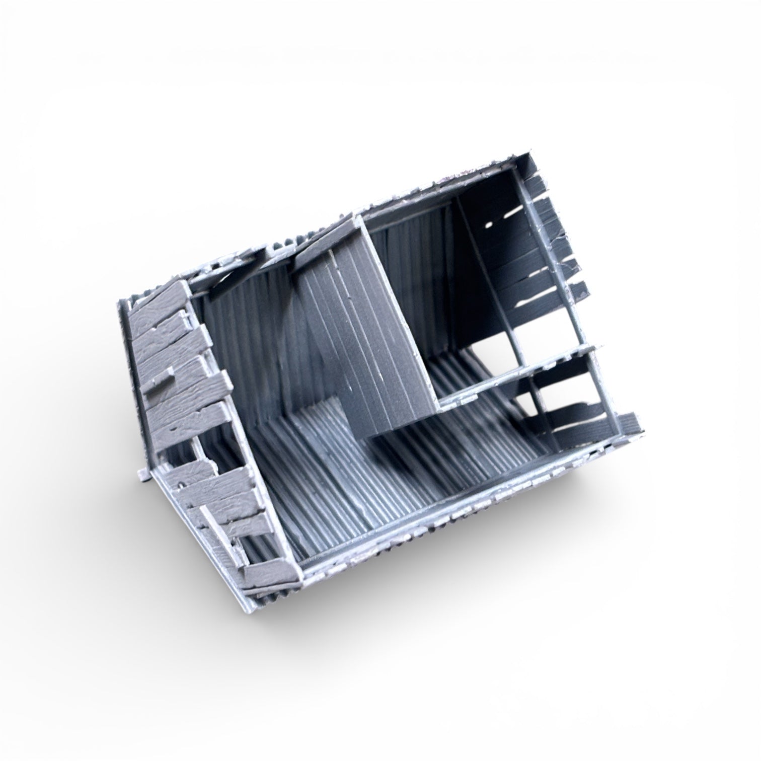 Fully detailed with distressed wood plank side and corrugated roof. Complete with interior detailing.